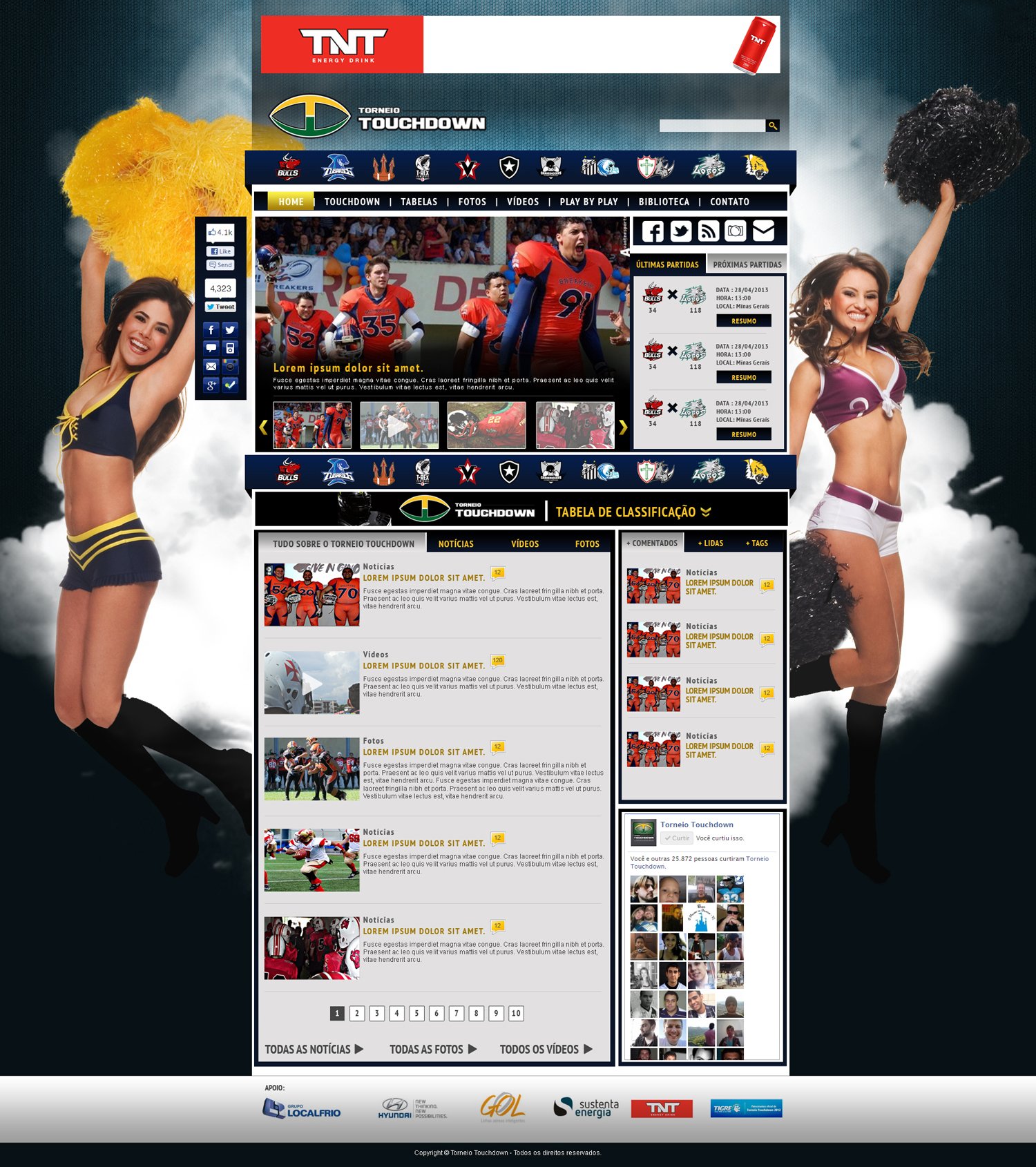 Interface dinâmica com classificação em tempo real, calendário de jogos atualizado e destaque para as equipes participantes. Navegação intuitiva que leva o usuário do play-by-play às fotos e vídeos dos melhores momentos. Design moderno com identidade visual forte, integrando patrocínios (TNT Energy Drink, Hyundai) sem comprometer a experiência do torcedor.